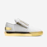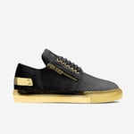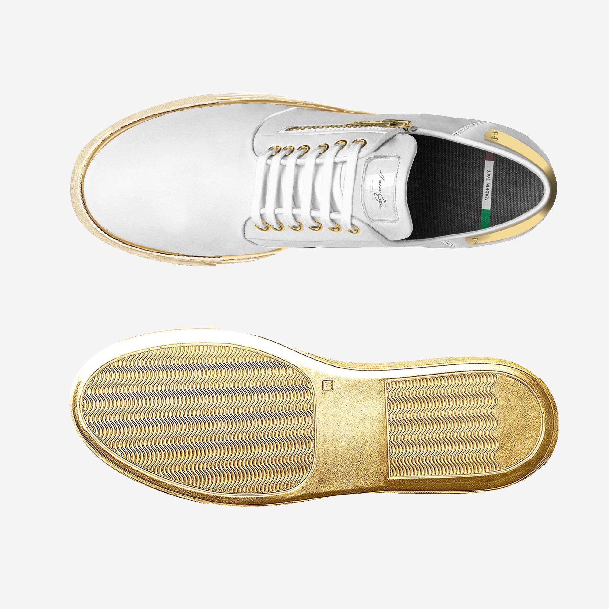 Our "Levan" shoe perfectly blends a fashion-forward look with a sporty sneaker design. Features include a modern metal accessory on the back, a metal zip in the center, and a lace-up front with six eyelets per side. Made from butter-soft Italian materials, its unique dark brown rubber sole adds comfort. The custom NAIM Eden™ logo on the tongue enhances visibility.